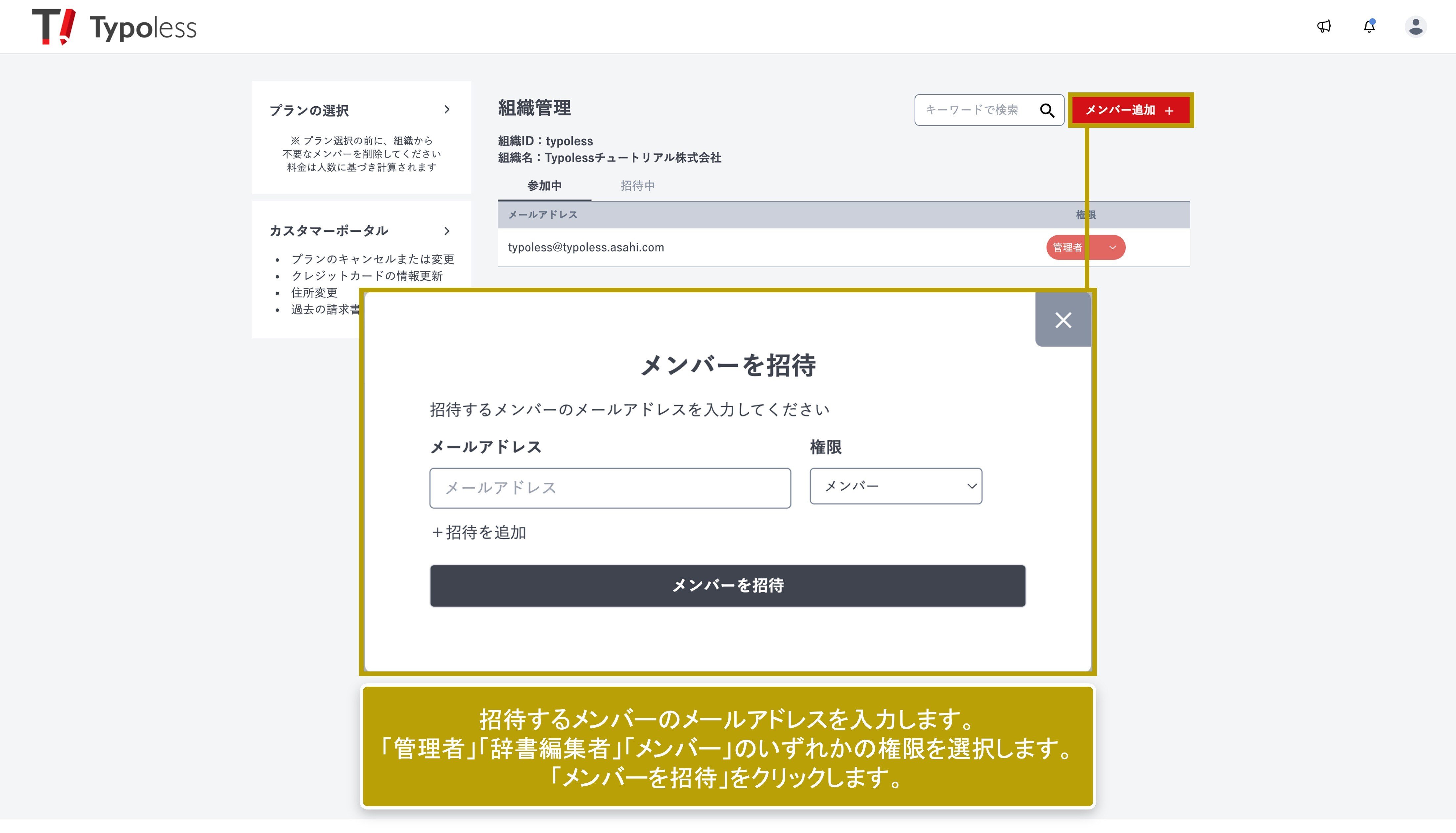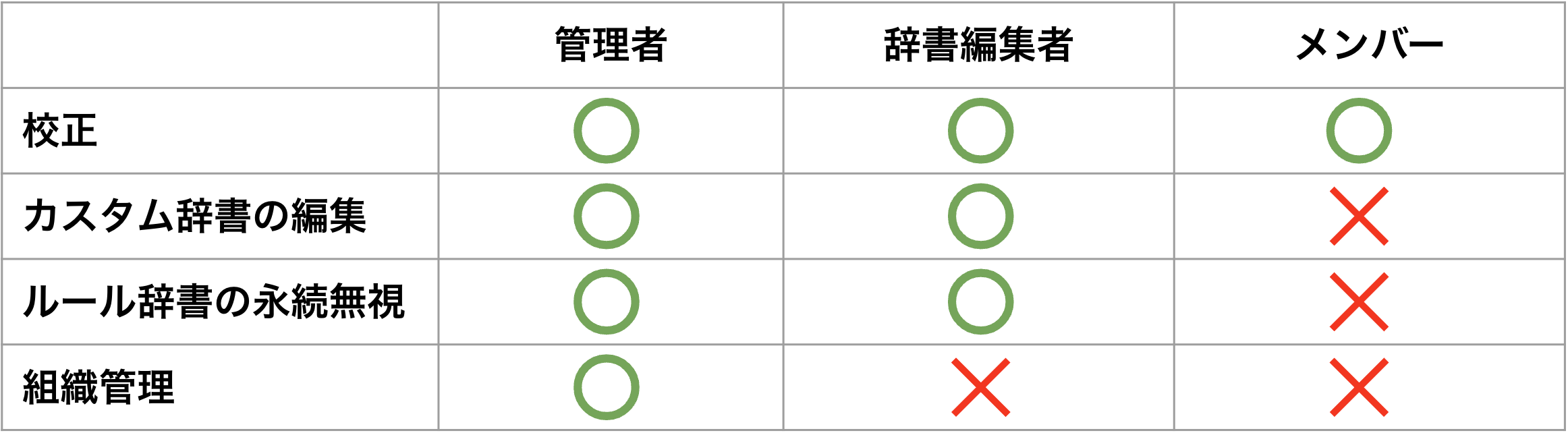 権限は「管理者」「辞書編集者」「メンバー」の3種類あります。