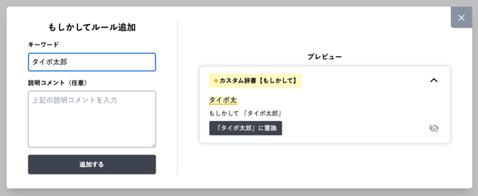 もしかしてルールは、正しいキーワードを登録しておくとそれに似た単語の出現を検知でき、人名や商品名などの固有名詞、長い英単語など、タイプミスや表記揺れを検知するのに有効です。