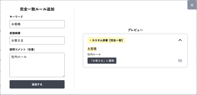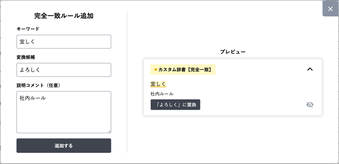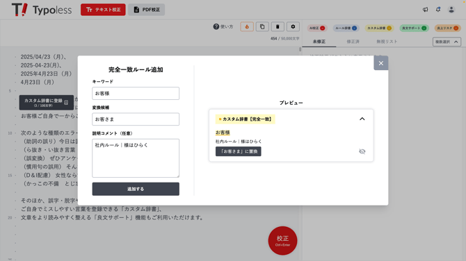 「カスタム辞書」はお客さまご自身の表記や校正ルールを登録できる機能で、この内容もふくめて校正にかけることができます。