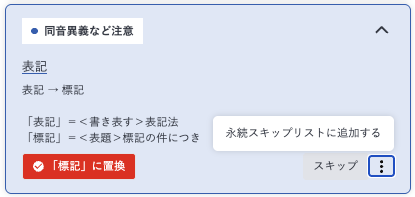 ルール辞書の指摘(青)を永続スキップできます。