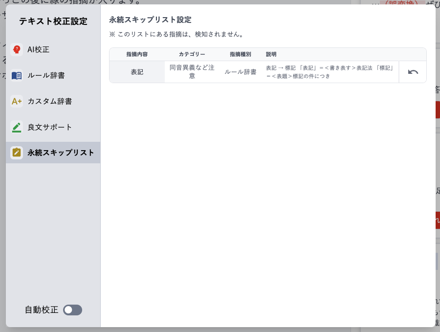 校正設定の「永続スキップリスト」をクリックすると、永続スキップリストの一覧が表示されます。
