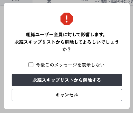 エンタープライズプランユーザーの場合、組織ユーザー全体に対して対象ルールの永続スキップが解除されることが提示されますので、問題がなければ「永続スキップを解除する」をクリックします。以上で該当のルールの永続スキップが解除されます。